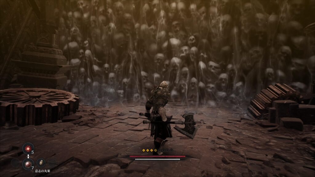正規ルートの階段を上っていくと、開けたエリアに出ます。この開けたエリアには兵士雑魚敵が5,6体はいます。投擲などで数を減らしてから挑みましょう。